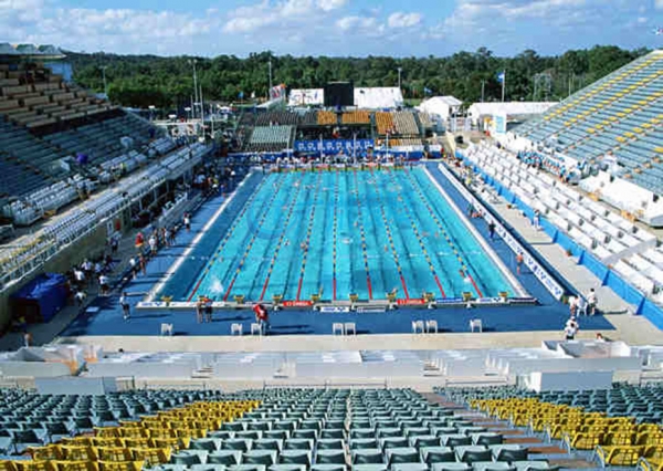 標準游泳池長50米,寬21米,奧運會世界錦標賽要求寬25米,另外還有長度只有一半即25米的游泳池稱為短池。水深大于1.8米。有8個泳道,每道寬2.5米,邊道另加0.5米,兩泳道間有分道線,分道線用浮標線分掛在池壁兩端,池壁內設掛線勾,池底和池端壁應設泳道中心線,為深色標志線。出發臺應居中設在每泳道中心線上,臺面50厘米×50厘米。臺面臨水面前緣應高出水面50至70厘米,臺面傾向水面不應超過10度。游泳池的池岸寬一般出發臺端不小于5米,其余池岸不小于3米。正式比賽池,出發臺池岸寬不小于10米,其他岸寬不小于5米。