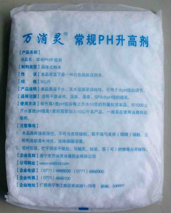 常規PH升高劑,堿含量大于98%。片堿、燒堿,提高水的PH值。5KG/包*4包/箱。每升高1度PH值按每立方水10克,即1000立方水搞高1度PH需要加入本品10KG。一般在使用萬消靈消毒劑后使用。